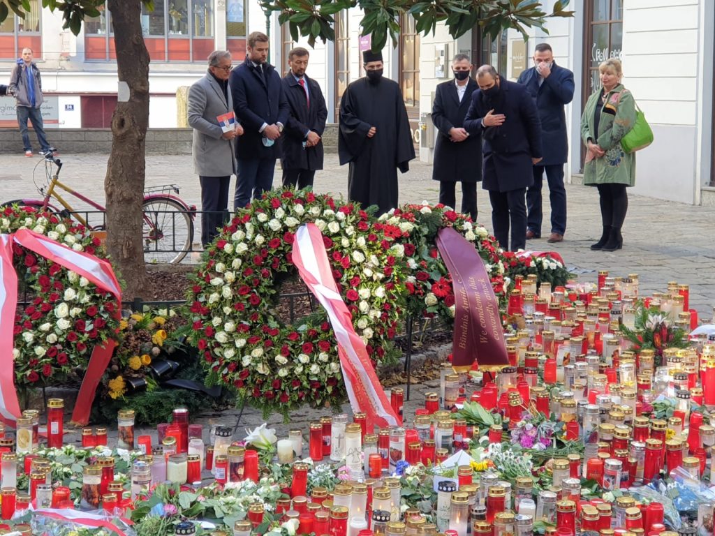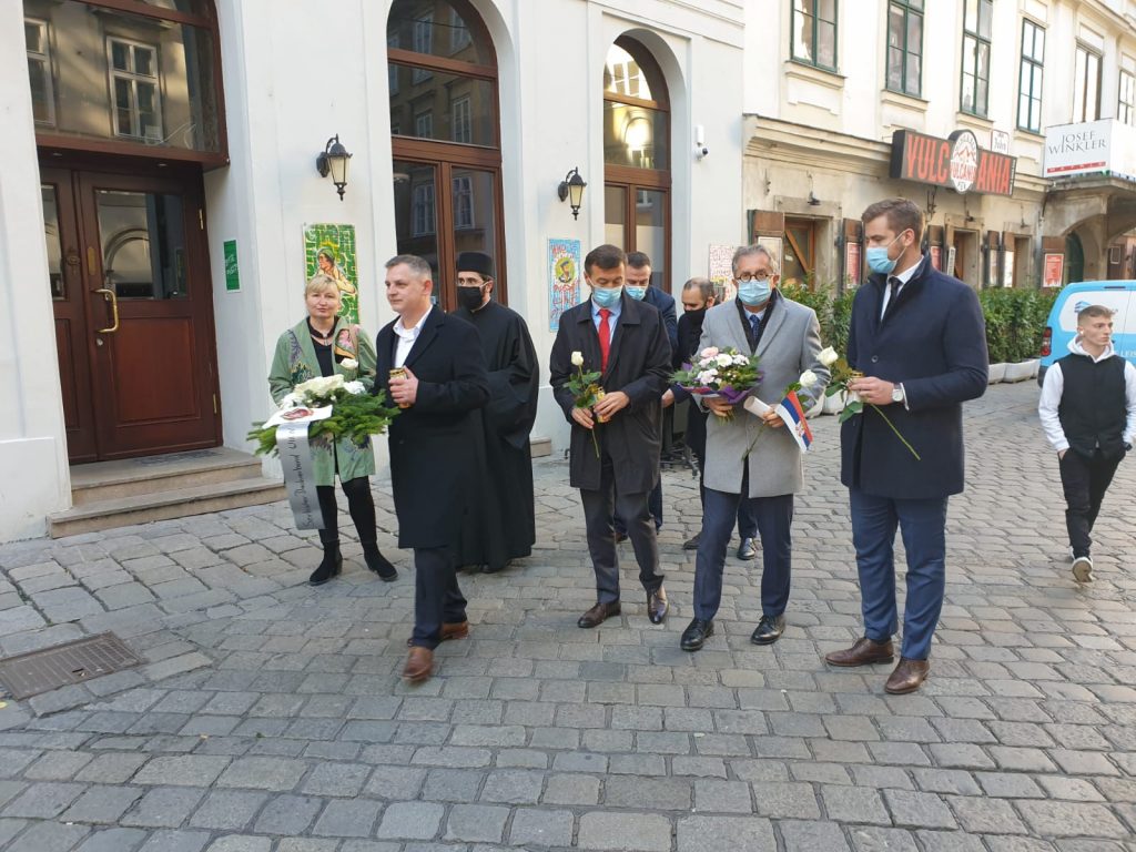 Prekjuče su Njegova ekselencija Nebojša Rodić, ambasador Republike Srbije, Luka Marković, predsednik Zajednice srpskih klubova u Beču, Siniša Bencun, ambasador BiH pri međunarodnim organizacijama u Beču, Mladen Filipović, direktor Predstavništva Republike Srpske, akademik Svetlana Matić, predsednik društva “Vilhelmina Mina Karadžić”, sa predstavnicima naših klubova i predstavnicima Srpske pravoslavne crkve položili venac u Ulici Judengasse na mestu terorističkog napada u glavnom gradu Austrije.