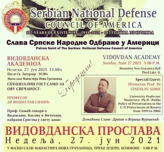 Takođe, u nedelju 27. juna, ali u 13 sati Srpska narodna odbrana, najstarija srpska organizacija u SAD, proslaviće Vidovdan i svoju slavu u maloj sali manastira Nova Gračanica kod Čikaga.