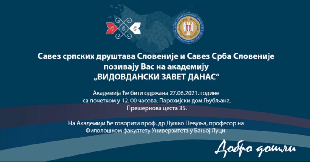 Savez srpskih drustava Slovenije i Savez Srba Slovenije uoči Vidovdana, 27.06.2021. godine prirediće akademiju “Vidovdanski zavet danas”. Akademija je upriličena povodom obeležavanja Vidovdana, izuzetno bitnog dana za srpski narod. Vidovdan je dan koji je obeležio srpsku istoriju ali u dobroj meri i definisao budućnost Srba.