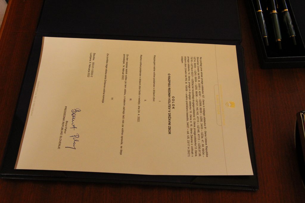 Ljubljana: 9. februar – Predsednik Republike Slovenije Borut Pahor je danes v sredo, 9. februarja 2022, ob 13. uri v Veliki dvorani Predsedniške palače podpisal odlok o razpisu letošnjih rednih volitev v Državni zbor Republike Slovenije za nedeljo 24. aprila 2022