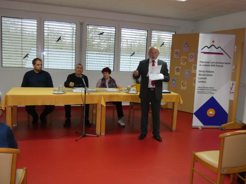 Ocenil je delo gornjeragonskega odbora za odličnooziroma, da je zgled ostalim 86 organizacijam ZZB NOB po Sloveniji. Posebej je izpostavil Občino Radenci, kjer je župan Ustanovi Šiftarjeva fundacija poslal zahtevo,da v svojem programu enači fašizem, nacizem in komunizem. Tega fundacija ni mogla sprejeti in od tedaj je Občina Radenci izven tega projekta in tudi več ne prispeva finančnih sredstev. Sledili sta pozdravi predstavnice Občine Gornja Radgona in Doma starejših občanov Gornja Radgona ter predsednika Društva Jožeta Časarja iz Puconec.