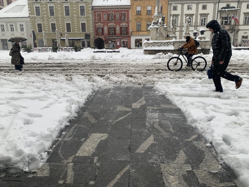Pešci se težko prebijajo po peš poteh, ki so jih ustvarili predhodni sprehajalci, stanovalci in lastniki ali najemniki poslovnih prostorov pa vsak po svoje odstranjujejo sneg pred svojimi vhodi.