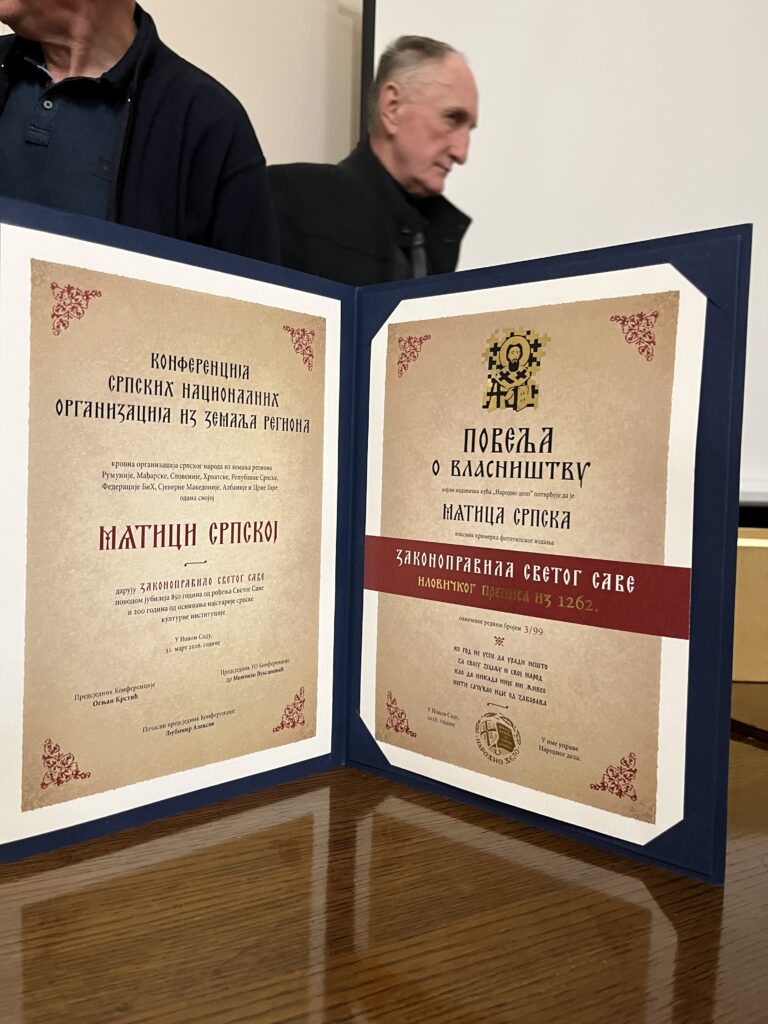 председнику Матице српске сертификат Иловичког преписа Законоправила из 1262.