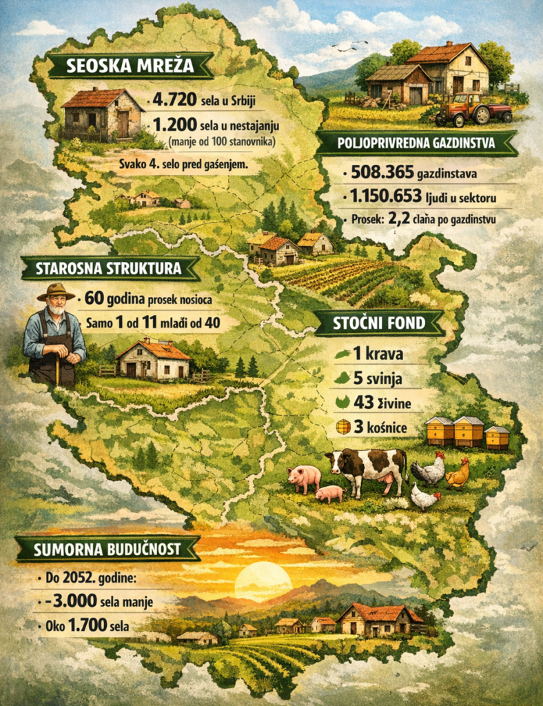 U Srbiji prema podacima RZS danas ima 4.720 sela, odnosno to piše u Ustavu, naseljenih mesta. Od toga 2052. godine, kako se navodi u istom izvoru, sa mape Srbije nestaće 3.000 takvih sela, odnosno naseljenih mesta!